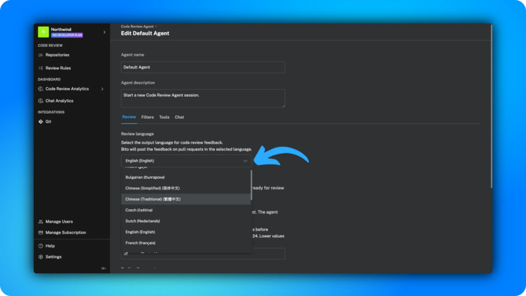 Bito’s AI Code Review Agent now speaks the language you prefer. Literally. You can set your preferred language in Bito Cloud, and every review comment, suggestion, and even chat reply will show up in that language.
